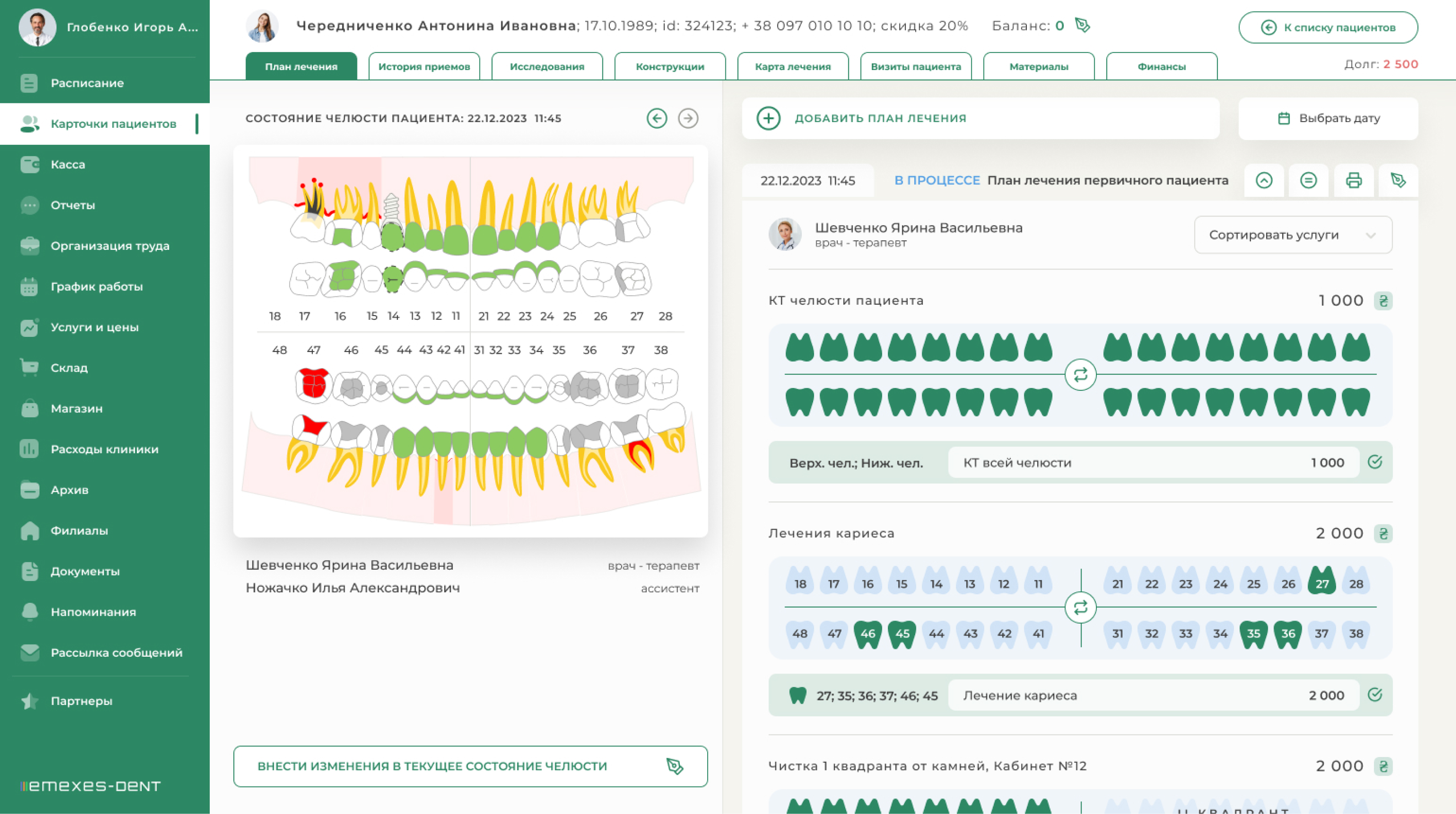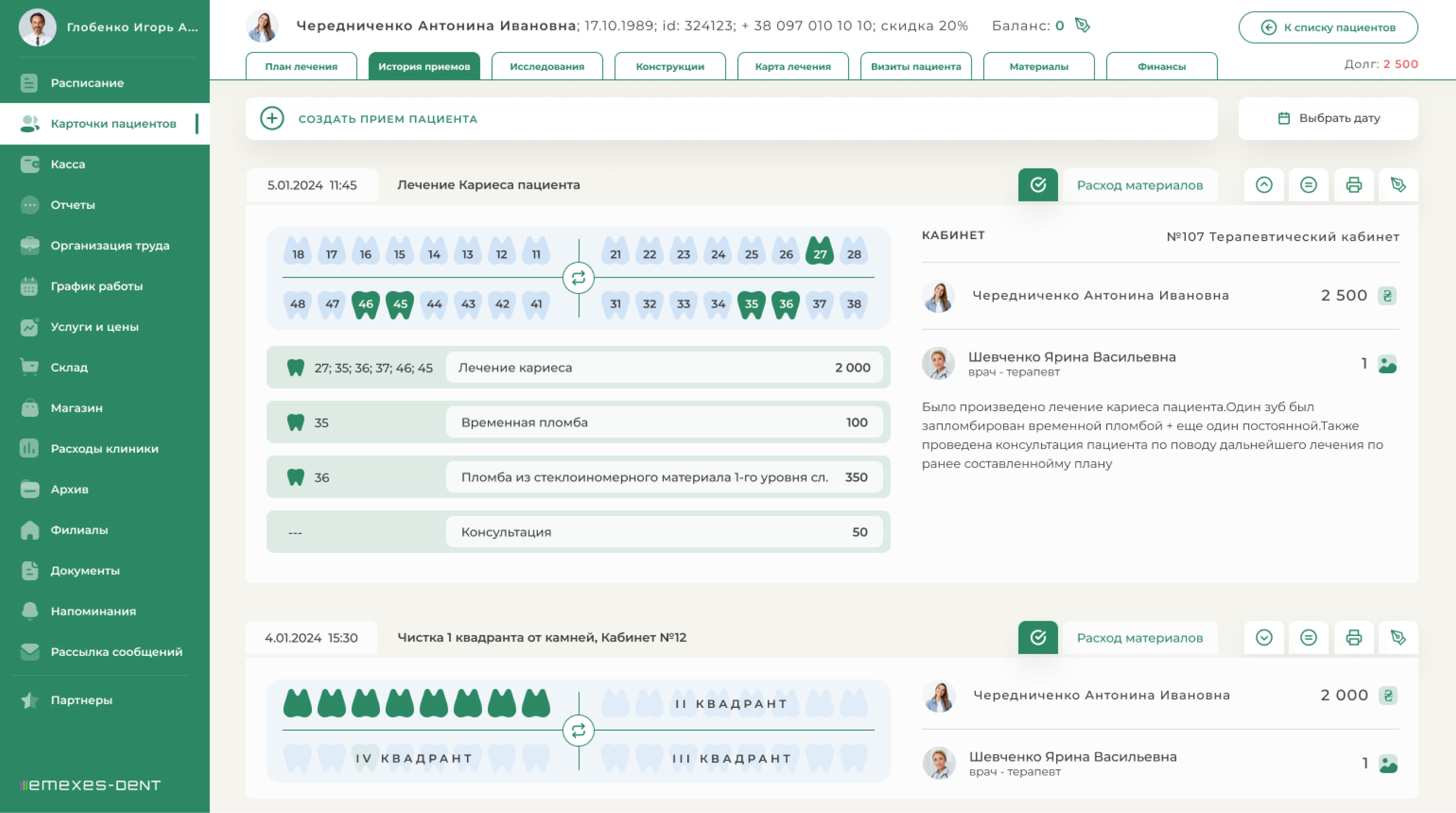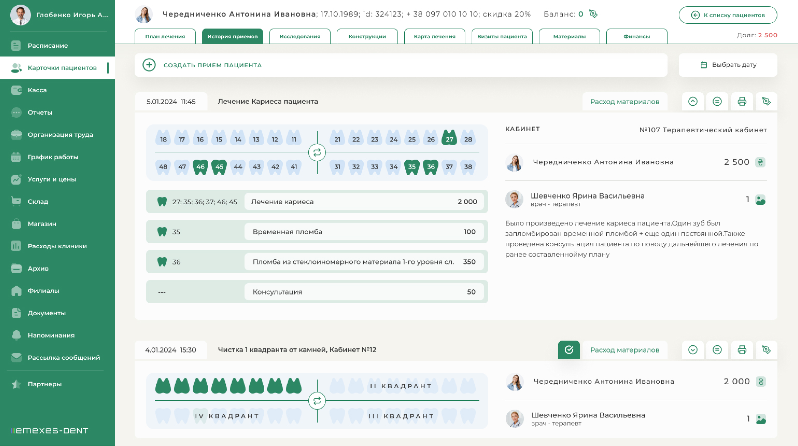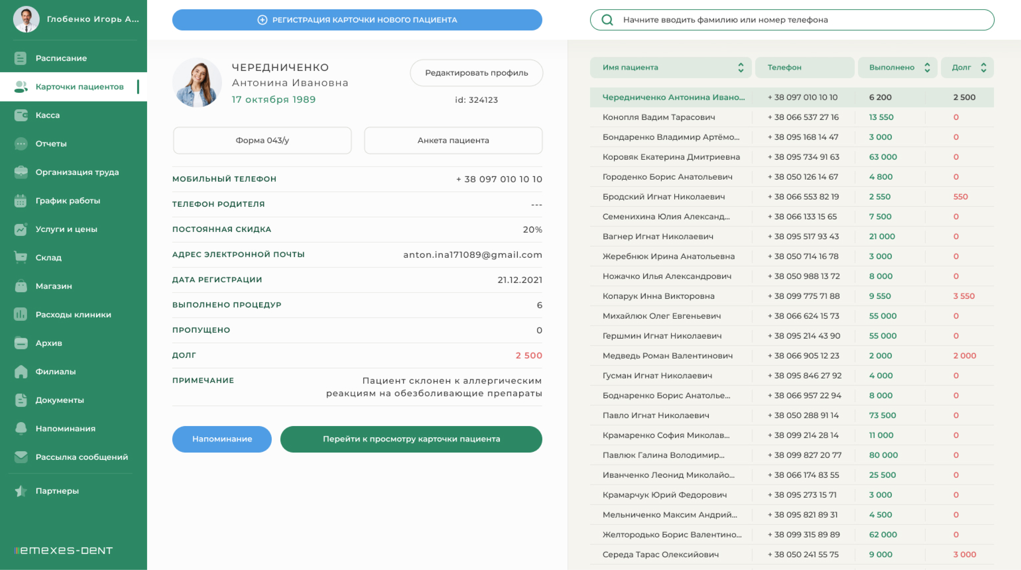 - Автоматизация всех процессов клиники: расписание, карточки пациентов, планы лечения, отчеты и многое другое